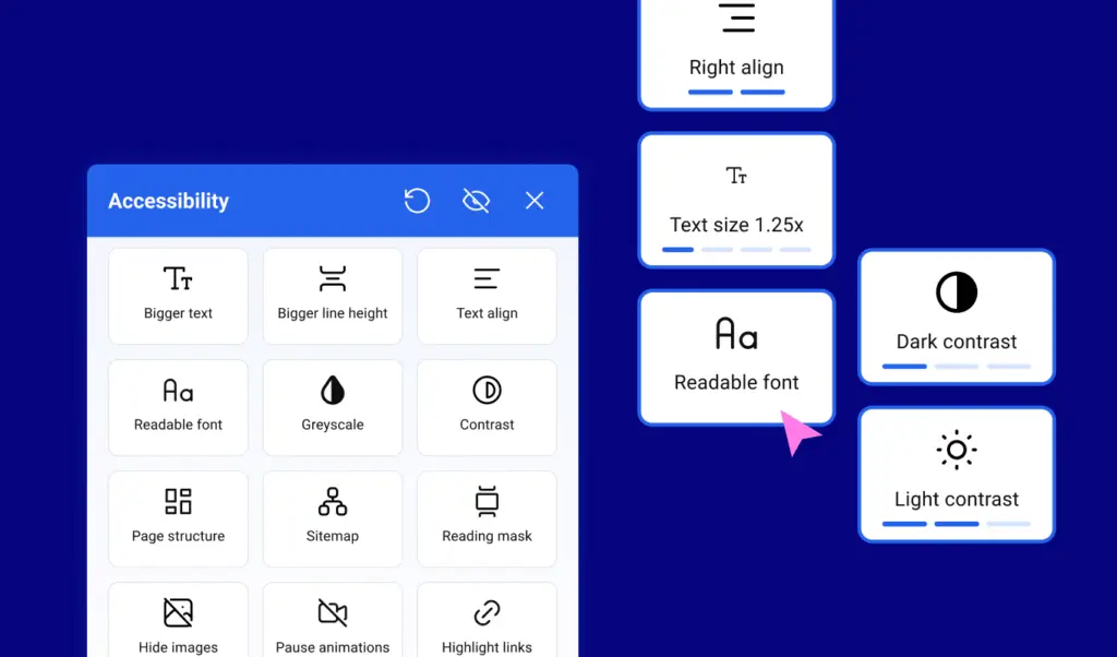 As part of our research, we studied many popular accessibility widgets and found a couple of helpful patterns: